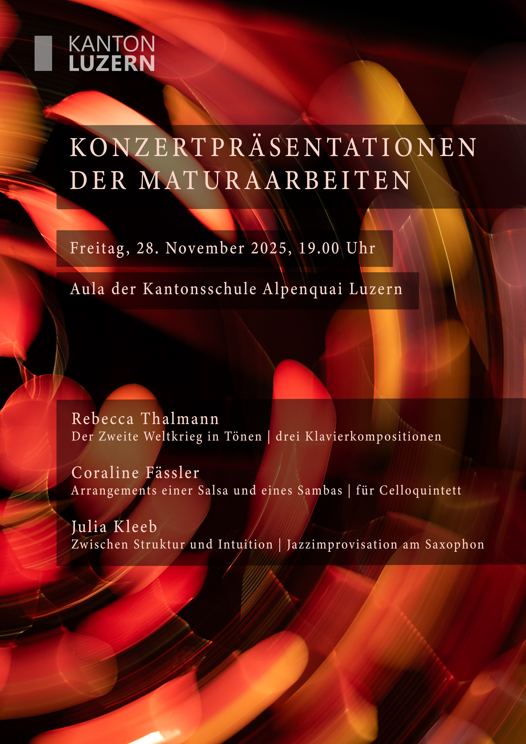 Die Präsentationen der Musikarbeiten am Freitagabend, 19.00 Uhr, bilden den Auftakt der Präsentationstage und finden im Rahmen eines öffentlichen Konzerts in der Aula der Kantonsschule Alpenquai Luzern statt.